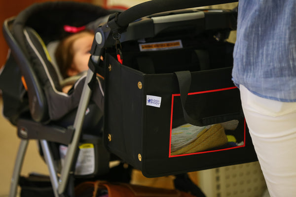 Buggy Baggy turns a stroller into a shopping cart in no time. No more one-handed stroller pushing, baby carriers on top of grocery carts or juggling baby and groceries at the same time!